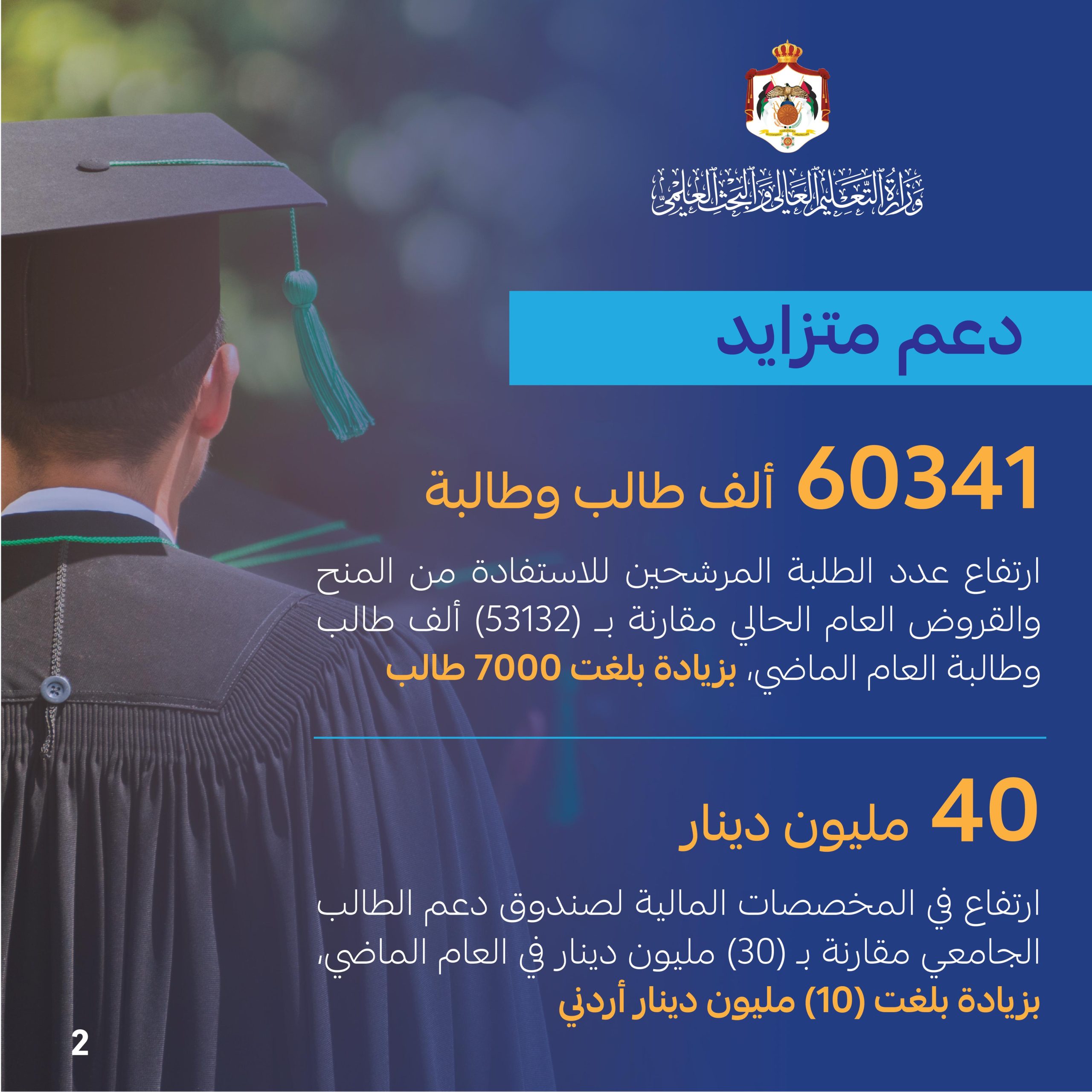 • ارتفاع المخصصات المالية لصندوق دعم الطالب الجامعي من (30) مليون دينار في العام الماضي إلى (40) مليون دينار في العام الحالي وبزيادة بلغت (10) مليون دينار أردني.