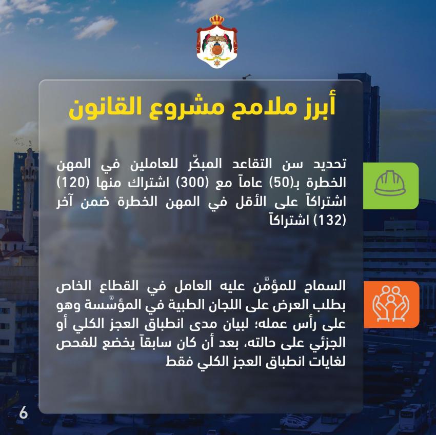 ويحدِّد مشروع القانون سن التقاعد المبكر للعاملين في المهن الخطرة بـ50 عاماً مع 300 اشتراك، منها 120 اشتراكاً على الأقل في المهن الخطرة ضمن آخر 132 اشتراكاً. كما يضمن مشروع القانون للعاملين في المهن الخطرة الذين استوفوا شروط السن وعدد الاشتراكات اللازمة للتقاعد قبل 1/1/2027 الحفاظ على حقوقهم في التقاعد متى رغبوا بذلك.