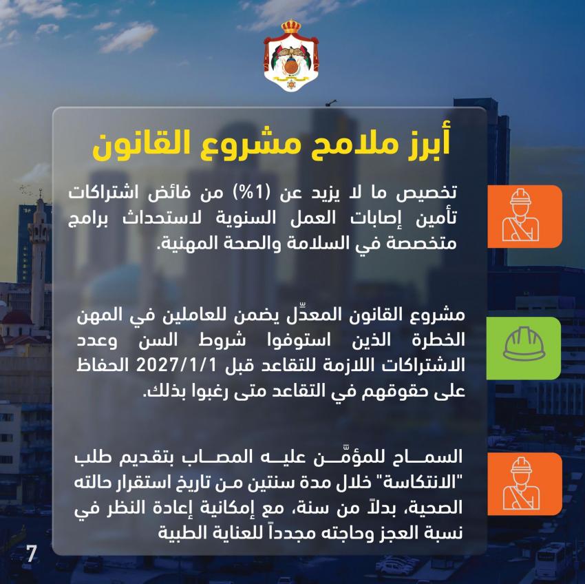 * مشروع القانون المعدِّل يضمن للعاملين في المهن الخطرة الذين استوفوا شروط السن وعدد الاشتراكات اللازمة للتقاعد قبل 1/1/2027 الحفاظ على حقوقهم في التقاعد متى رغبوا بذلك.
