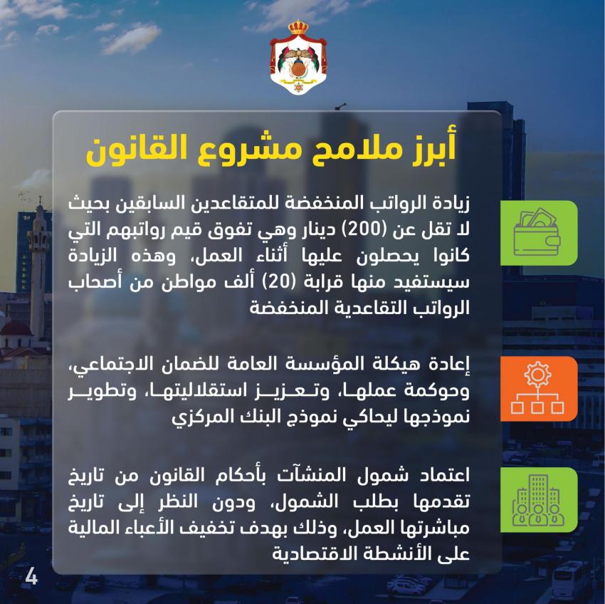 وستتمّ زيادة الرواتب المنخفضة للمتقاعدين السابقين بحيث لا يقل حدُّها الأدنى عن 200 دينار، وهي تفوق قيم رواتبهم التي كانوا يحصلون عليها أثناء العمل، علماً بأنَّ عدد المستفيدين من هذ