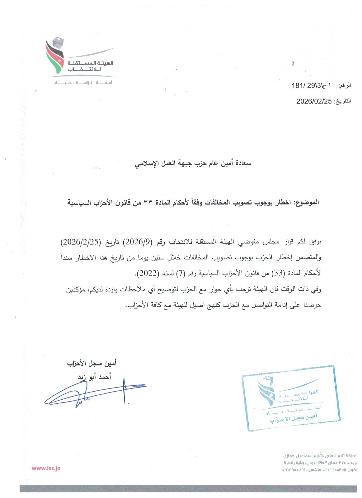 طالبت الهيئة المستقلة للانتخاب رسميًا حزب جبهة العمل الإسلامي بتغيير اسمه، معتبرة أنه قائم على أساس ديني بما يخالف أحكام القانون، ومنحت الحزب مهلة 60 يومًا لتصويب ما وصفته بـ”المخالفات” الواردة في نظامه الأساسي، وعلى رأسها الاسم.