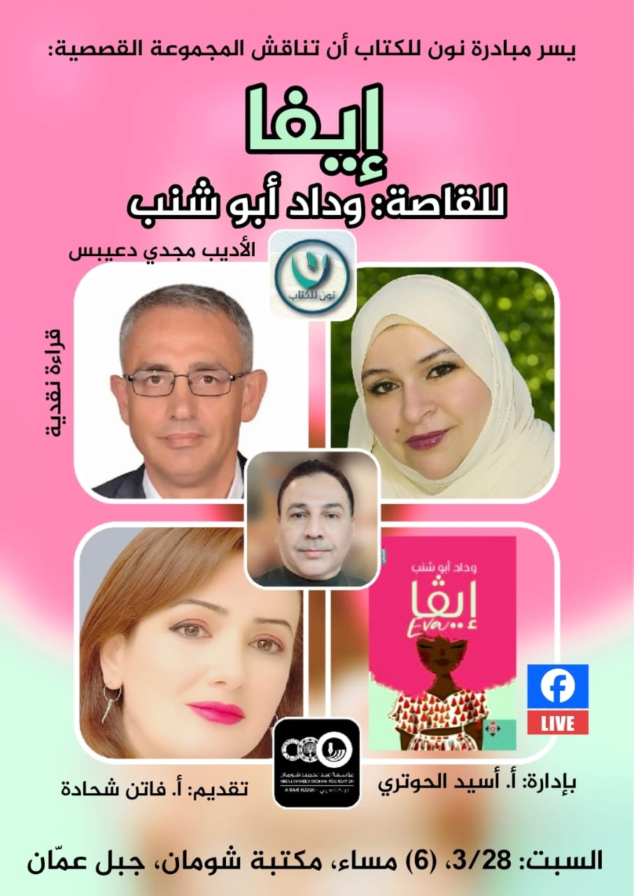 عمّان- تعقد مبادرة “نون للكتاب” الساعة السادسة من مساء يوم السبت الموافق 28 آذار/مارس 2026 جلستها الأربعين في مكتبة عبد الحميد شومان بجبل عمّان، حيث تستضيف القاصة وداد أبو شنب لمناقشة مجموعتها القصصية “إيفا”.