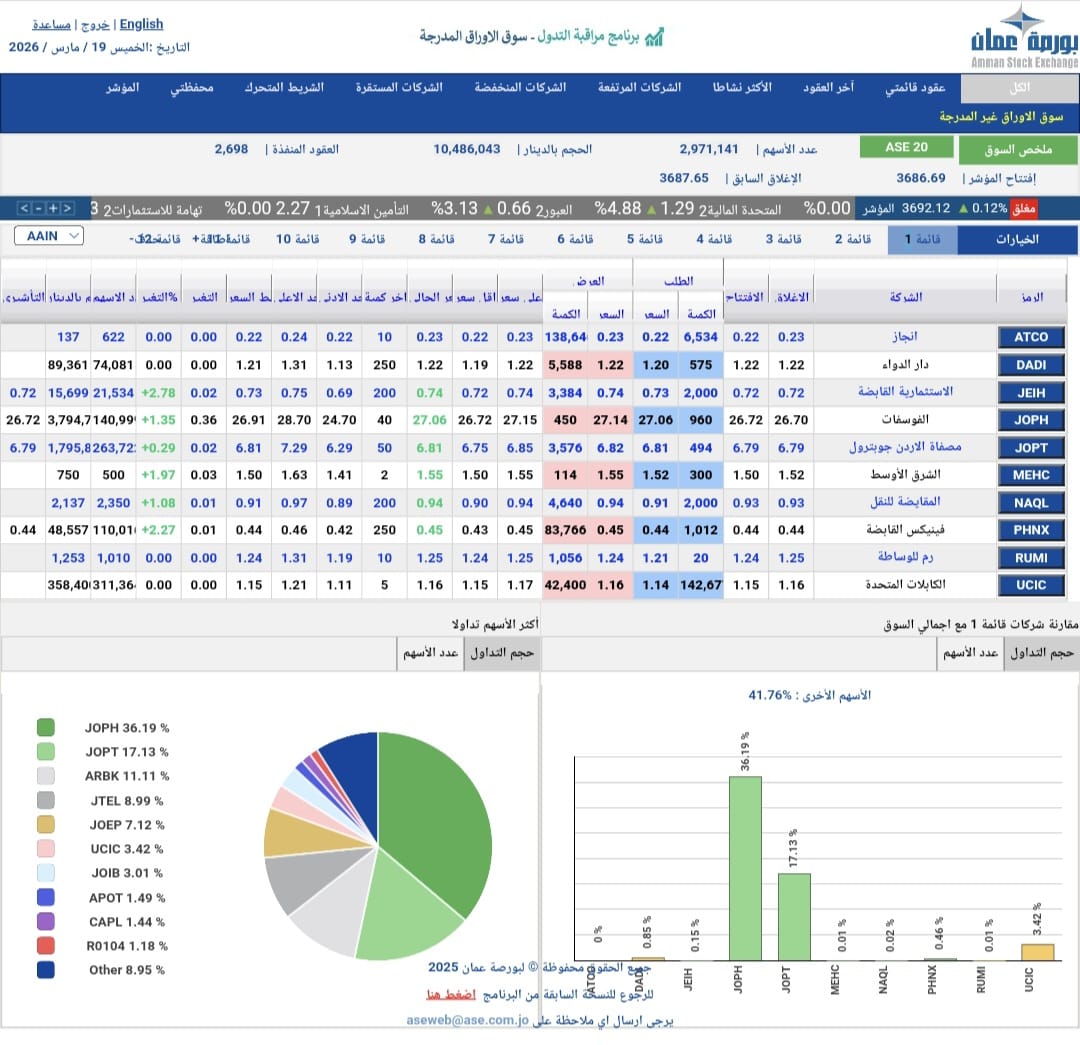 تصدر سهم شركة مناجم الفوسفات الأردنية نشاط التداول في بورصة عمان خلال جلسة اليوم الخميس، مسجلًا تداول 140,999 ألف سهم بقيمة إجمالية بلغت 3,794,714 مليون دينار، مستحوذًا على 36,19% من إجمالي حجم التداول في السوق، في مؤشر واضح على قوة الطلب عليه.