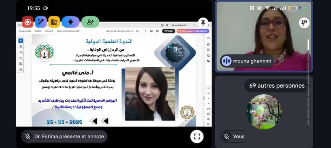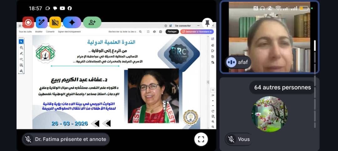 كما تطرقت الأستاذة أكرام عبد الرحماني من الجزائر إلى العلاقة بين الصدمة النفسية والإدمان، فيما اختتمت الأستاذة منى غانمي من تونس بعرض قانوني مقارن حول الجرائم الأسرية المرتبطة بالمخدرات بين ظرف التشديد ومانع المسؤولية.