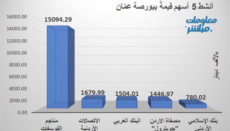 تصدّر سهم مناجم الفوسفات قائمة الأسهم الأنشط من حيث قيمة التداول في بورصة عمّان بنهاية جلسة اليوم، بعدما سجل تداولات بلغت نحو 15.09 مليون دينار، وتلاه سهم الاتصالات الأردنية بقيمة 1.67 مليون دينار.