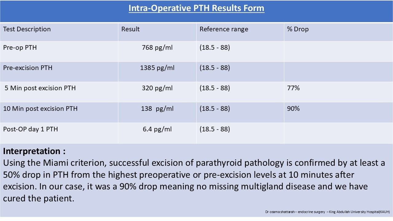 قام فريق جراحة الغدد الصماء بقيادة الدكتور أسامة شطارة ومقيمي الجراحة د احمد حمايدة , د عبدالله بني هاني، وبالتعاون مع فريق التخدير د خالد ردايدة و د سالم خاطر، وفريق تمريض العمليات سوسن ابداح و فاطمة بني سلامة، وفريق مختبر الكيمياء الحيوية بإشراف السيدة نهى عبيد في مستشفى الملك عبدالله المؤسس الجامعي بإجراء عملية استئصال غدة جارة درقية متضخمة (Focused parathyroidectomy) لمريض يعاني من ارتفاع الكالسيوم في الدم تسبب في حدوث حصوات متكرر في المسالك البولية و هشاشة عظام مبكرة نتيجة وجود فرط نشاط الغدد الجارات الدرقية الاولي (Primary Hyperparathyroidism) باستخدام تقنية نوعية لقياس هرمون جارات الدرقية اثناء العملية (IOPTH Monitoring) لاستئصال الغدة المتضخمة بدقة وللتأكد من عدم وجود تضخم في الغدد الجارات الدرقية الأخرى(Double adenomas & Hyperplasia ) دون الحاجة لأجراء عملية استكشاف كامل الرقبة (Bilateral neck exploration).