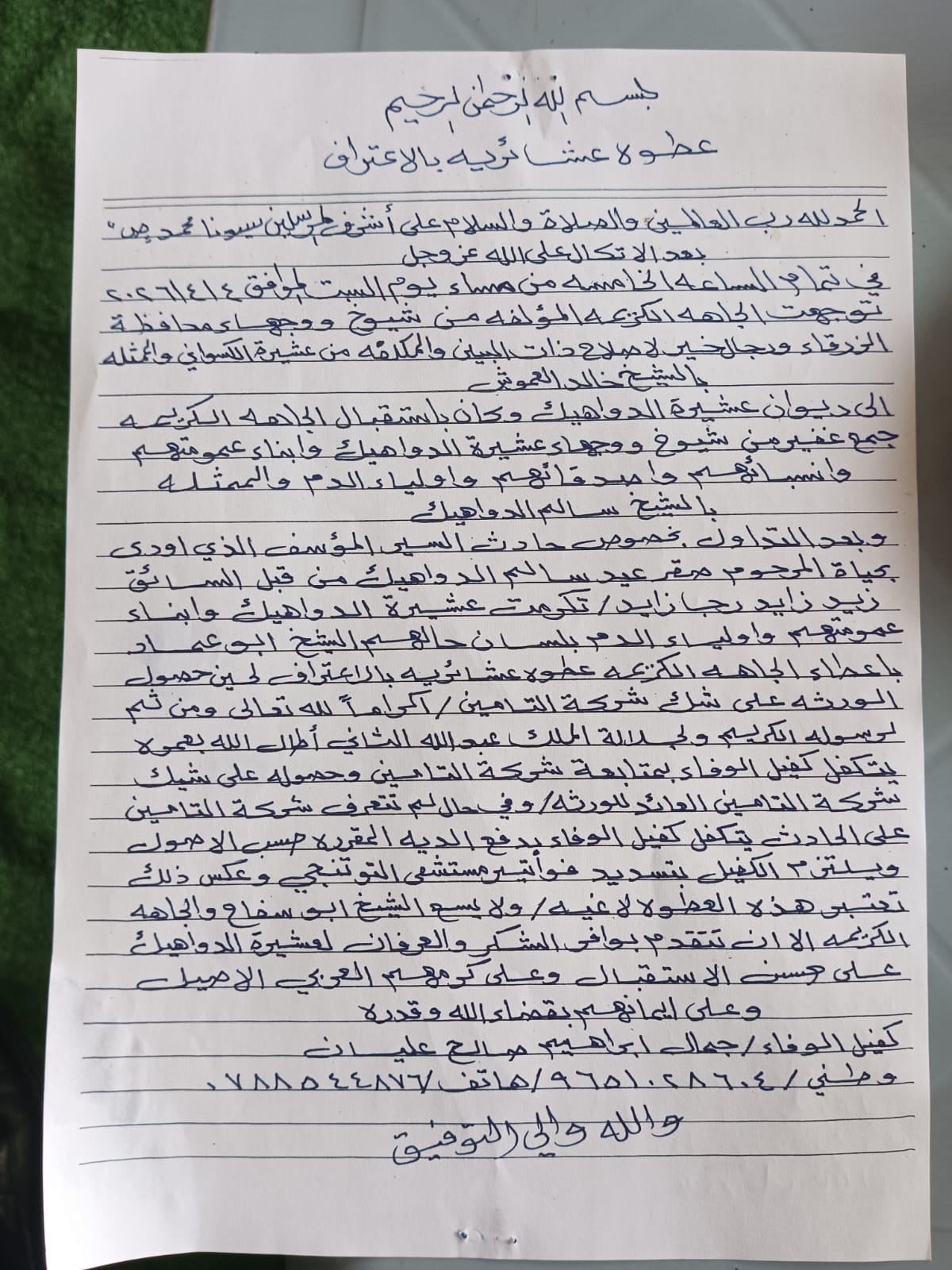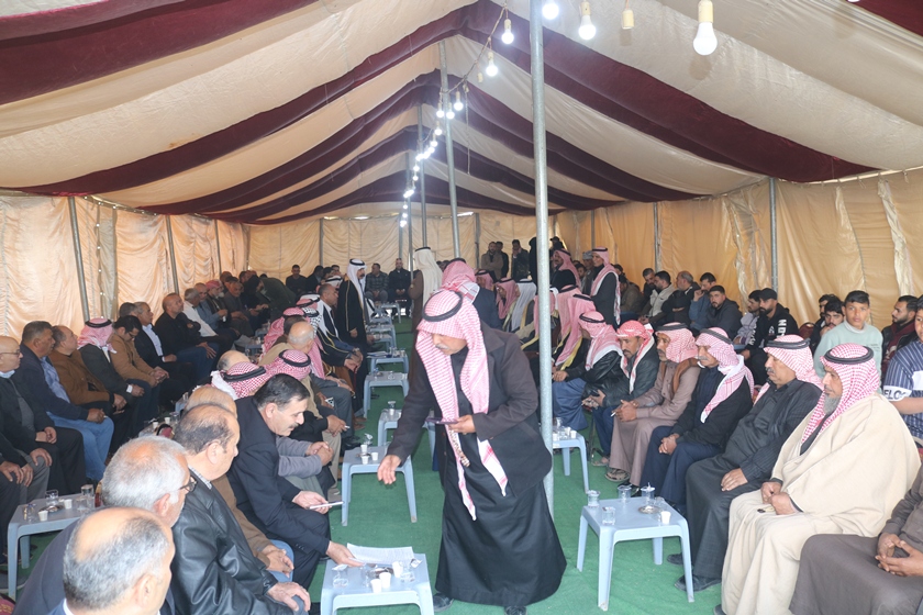توجهة مساء اليوم السبت الموافق 4 / 4 / 2026 جاهة عشائرية كبيرة من شيوخ ووجهاء ومخاتير الزرقاء ترأسها الشيخ خالد العموش ابو سفاح لمضارب عشيرة ” الدواهيك ” لاخذ عطوة اعتراف بحادث سير تسبب به السائق زيد زايد الكسواني , اودى بحيات الشاب صقر عيد سالم الدواهيك رحمه الله , حيث كان في استقبال الجاهة الشيخ سالم الدواهيك ابو عماد وجمع غفير من أبناء عشيرة الدواهيك ، وتحدث العموش في بداية حديثه بالرحمه للمتوفي وقرأت الفاتحة عن روح المرحوم .