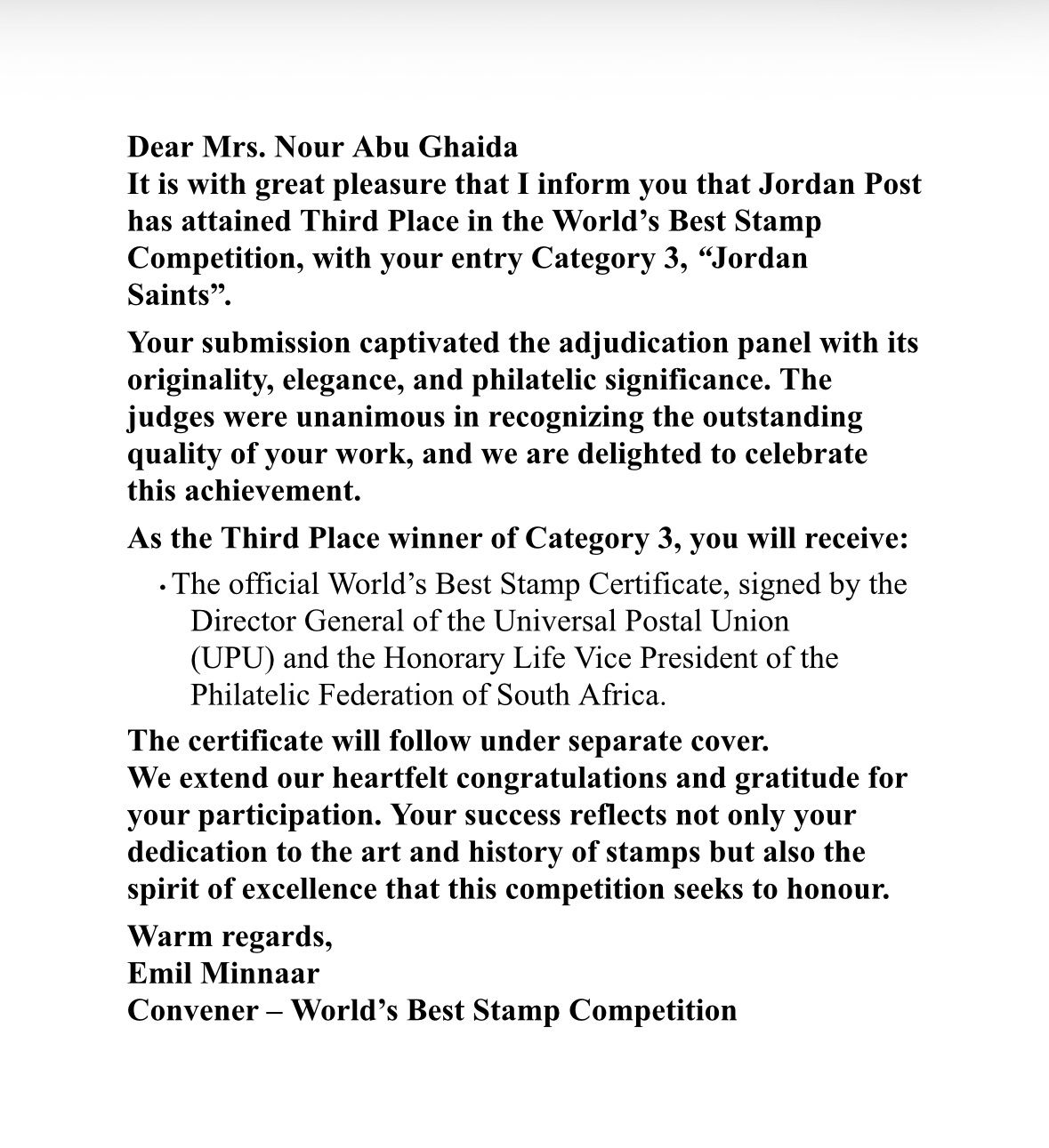 وأسفر هذا الفوز عن حصول البريد الأردني على شهادة “أفضل طابع في العالم” الرسمية، وهي شهادة مرموقة موقعة من المدير العام للاتحاد البريدي العالمي ونائب الرئيس الفخري لاتحاد هواة جمع الطوابع في جنوب أفريقيا، في تأكيد دولي جديد على جودة وتميز الطابع الأردني.