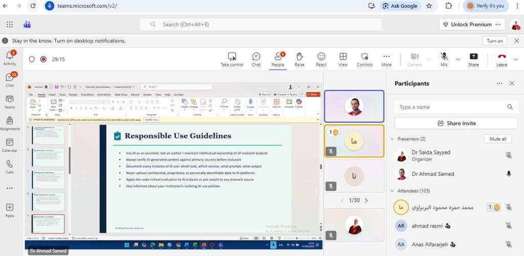 وقد تناولت الورشة أيضا عدة محاور تضمنت النزاهة الأكاديمية والمخاطر الأخلاقية وخصوصية البيانات في استخدام الذكاء الاصطناعي وآليات الإفصاح والشفافية عند استخدام مختلف أدوات الذكاء الاصطناعي.