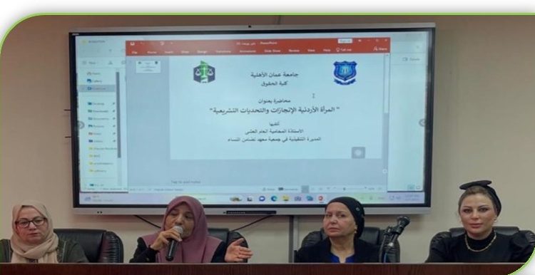 نظمت كلية الحقوق في جامعة عمّان الأهلية يوم الثلاثاء 7 / 4 / 2026 محاضرة توعوية متخصصة بعنوان “المرأة الأردنية: الإنجازات والتحديات التشريعية”، قدمتها الأستاذة المحامية أنعام العشا، المديرة التنفيذية في جمعية معهد تضامن النساء، وسعادة الدكتورة أدب السعود، وذلك بإشراف كل من الدكتورة أمل الرفوع والدكتورة إيمان الوريكات في قاعة “موسى الساكت”، بحضور عدد من أعضاء الهيئة التدريسية وطلبة الكلية.