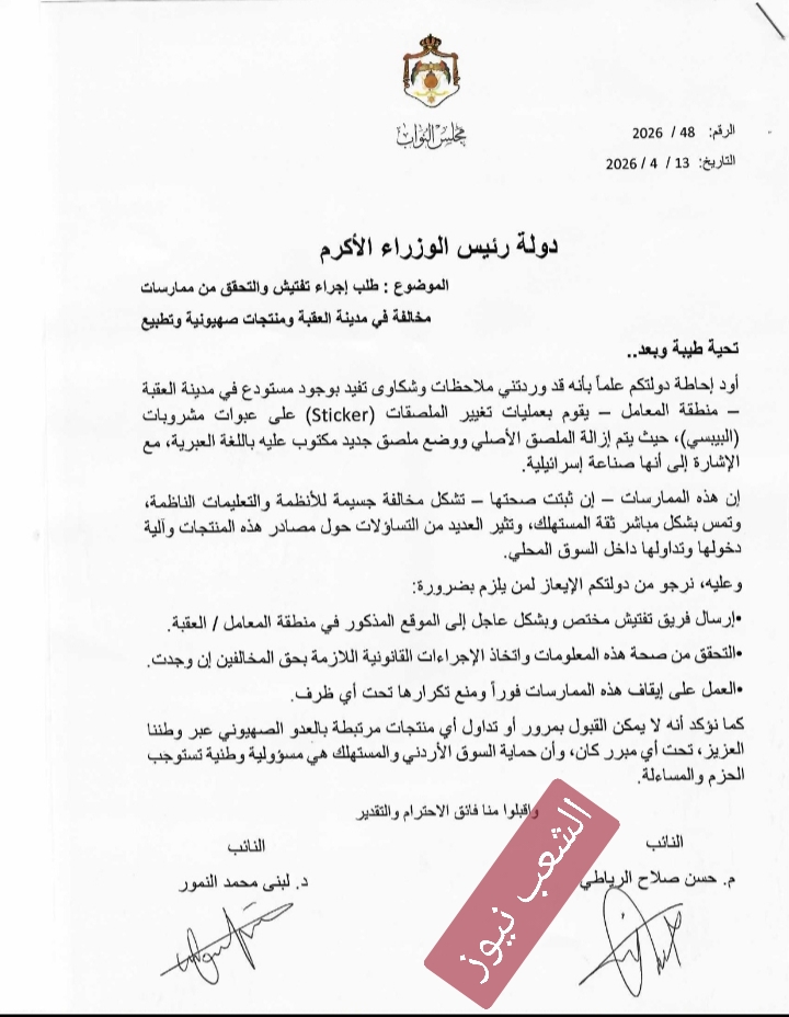وفي مذكرة رسمية موجّهة إلى رئيس الوزراء، كشف النائبان م. حسن صلاح الرياطي ود. لبنى محمد النمور عن تلقي شكاوى تفيد بوجود مستودع في منطقة المعامل بالعقبة يقوم بإزالة الملصق الأصلي لمنتجات “البيبسي”، واستبداله بملصقات تحمل دلالات على منشأ إسرائيلي، الأمر الذي أثار موجة استهجان وتساؤلات واسعة حول آلية دخول هذه المنتجات إلى السوق المحلي.