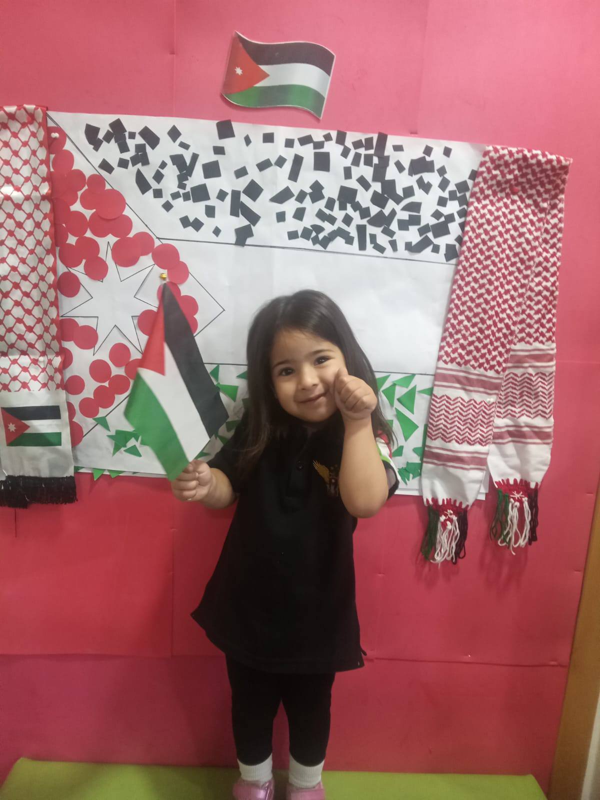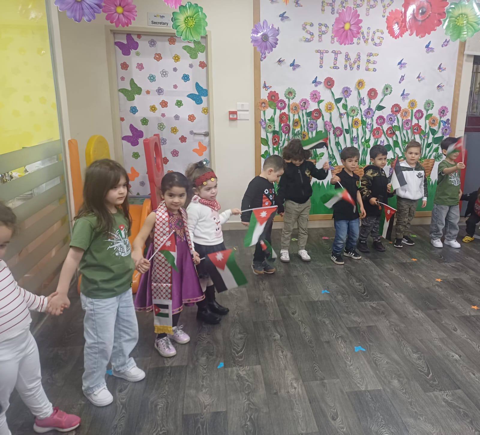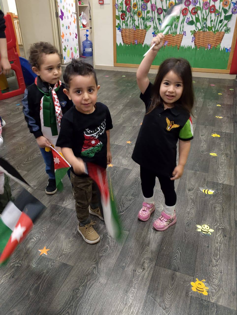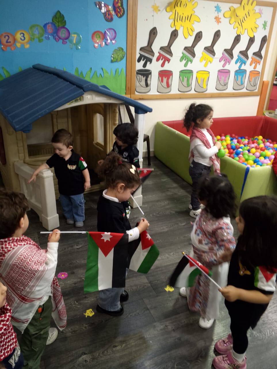 وتخلل الاحتفال فقرات غنائية وأهازيج شعبية، رافقتها رقصات طفولية مليئة بالحيوية والسعادة، فيما تألق الأطفال بارتداء الشماغ الأردني، والتقطوا الصور التذكارية أمام العلم والصور الوطنية.