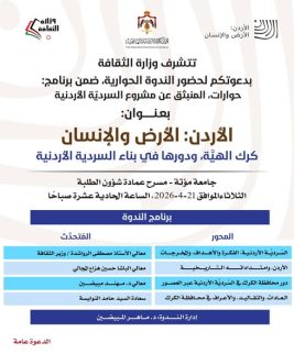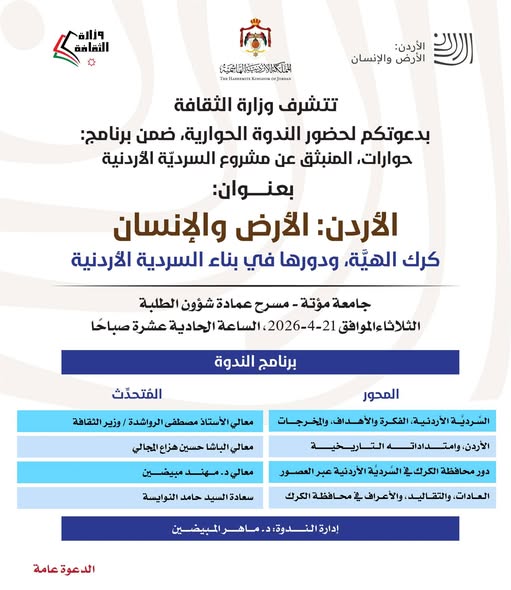 تُعلن مديرية ثقافة محافظة الكرك عن تنظيم فعالية ثقافية بعنوان “الأردن: الأرض والإنسان – كرك الهيّة ودورها في بناء السردية الأردنية”، وذلك يوم الثلاثاء الموافق 21 نيسان 2026، عند الساعة الحادية عشرة صباحًا.