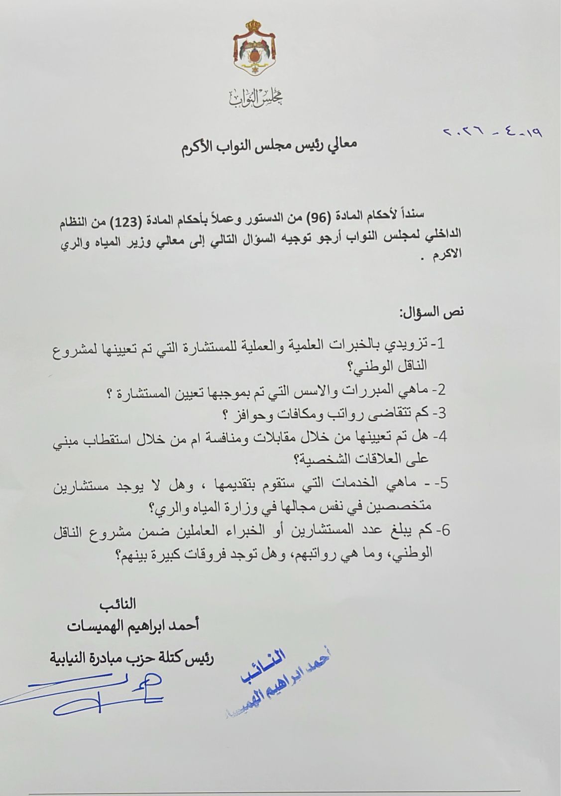 وجّه النائب أحمد هميسات أسئلة نيابية إلى وزير المياه والري، استفسر فيها عن الأسس والمعايير التي تم اعتمادها لتعيين مستشارة ضمن مشروع الناقل الوطني.