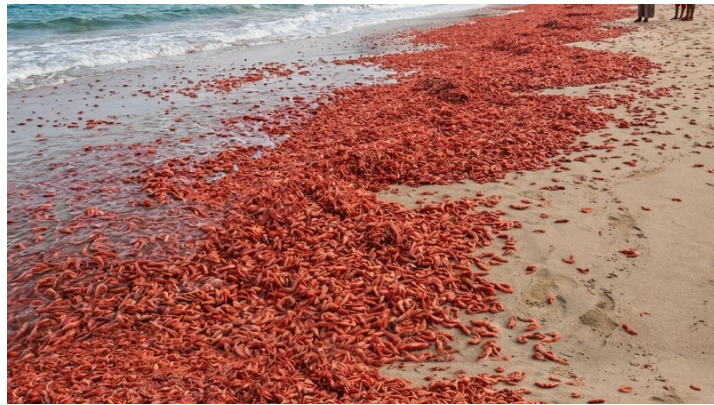 كارثة صادمة في بحر عُمان .. نفوق أطنان من الروبيان يحوّل الشواطئ إلى اللون الأحمر والسلطات توضح