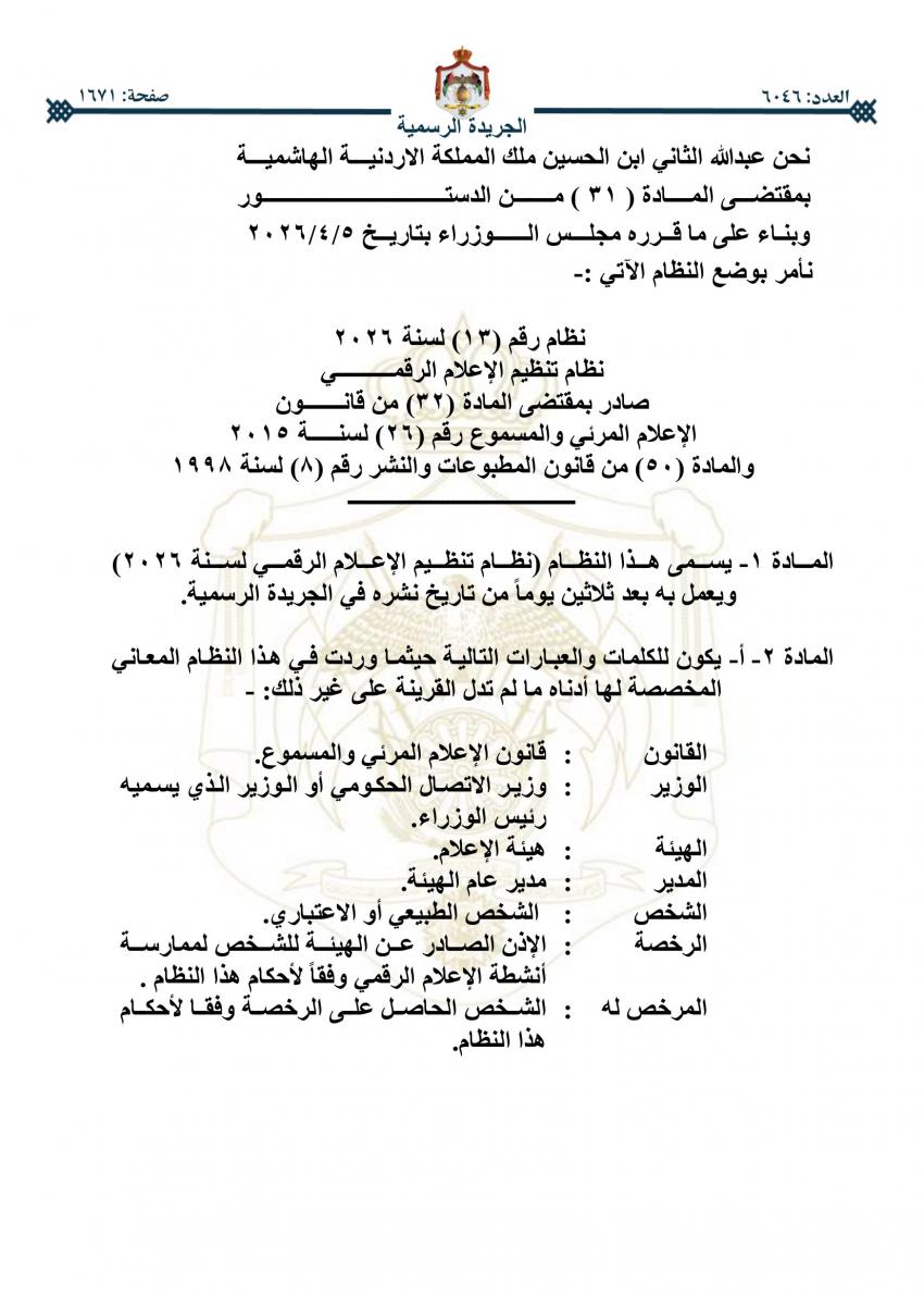 صدر في عدد الجريدة الرسمية اليوم الخميس، نظام تنظيم الإعلام الرقمي لسنة 2026.