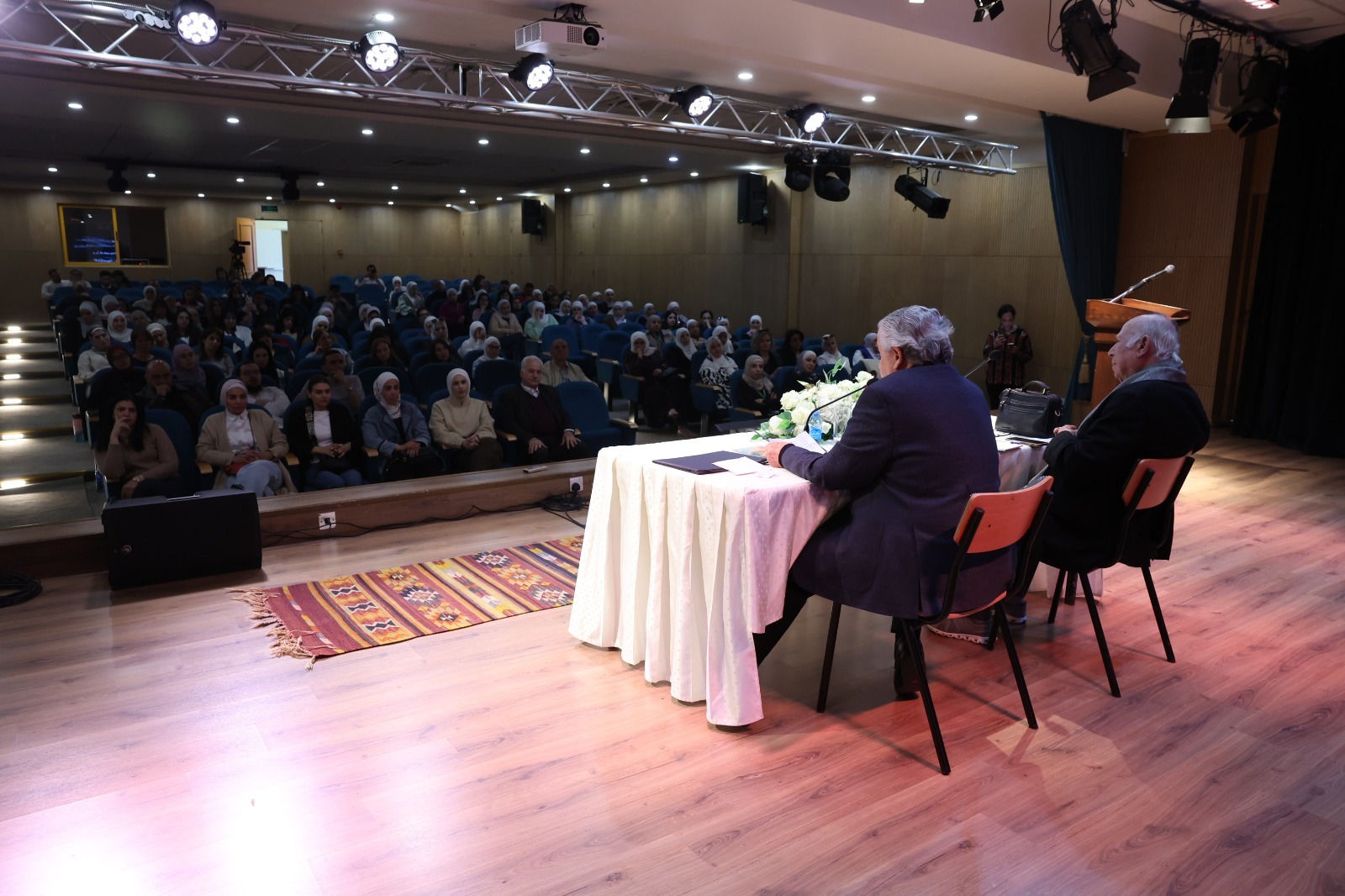 قدّم الدكتور أسعد المحاضر بوصفه أحد أعمدة الدرس الفلسفي في الأردن، مضمنا سيرته العلمية في إشارات دالة: أستاذًا للفلسفة في الجامعة الأردنية منذ مطلع السبعينيات، وعميدًا سابقًا لكلية الدراسات العليا والآداب، ورئيسًا مؤسسًا للجمعية الفلسفية العربية، ورئيسًا لرابطة الكتّاب الأردنيين، فضلًا عن حضوره البحثي في مجالات الفلسفة الأوروبية الحديثة، والفلسفة العربية الإسلامية، والفكر العربي الحديث والمعاصر—مؤكدًا، في لفتة ذات دلالة، أن هذا النموذج الأكاديمي «لم يُنهكه الزمن»، بل بقي فاعلًا في المشهد الفكري.