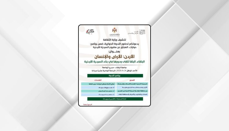 تنظّم وزارة الثقافة في جامعة البلقاء يوم غد الاحد ندوة حوارية ضمن برنامج حوارات المنبثق عن مشروع السردية الأردنية بعنوان: الأرض والإنسان- البلقاء، البلقا تلقى ودورها في بناء السردية الأردنية”.
