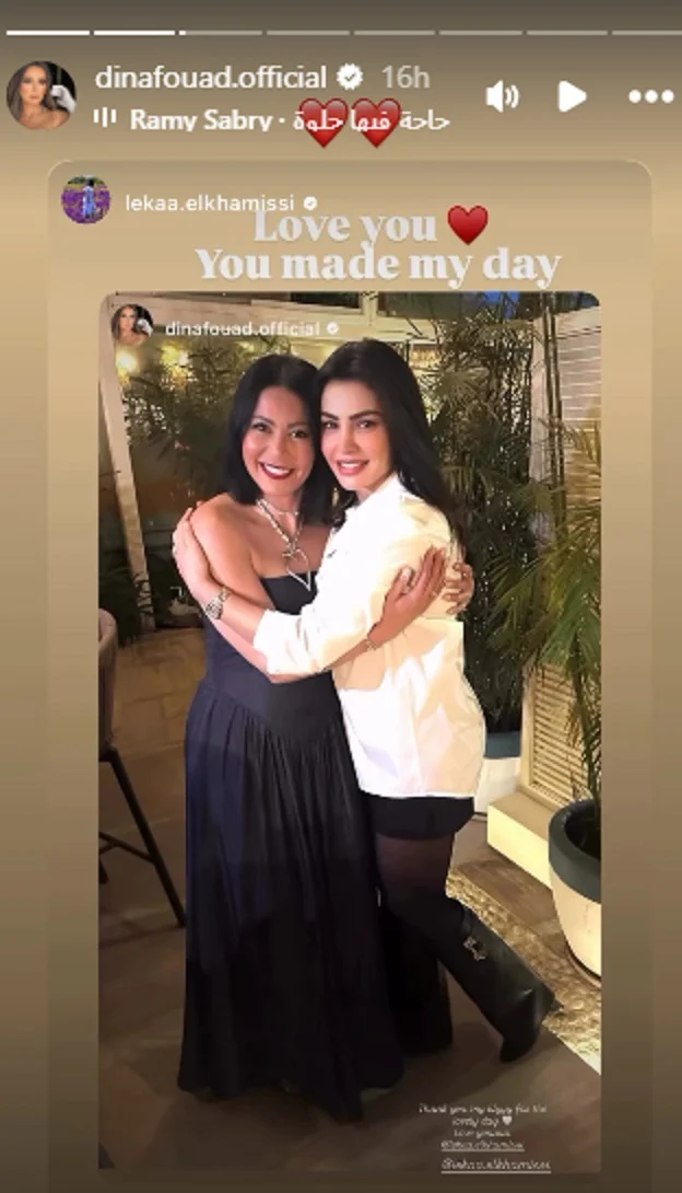 نشرت الفنانة دينا فؤاد عبر خاصية القصص المصوّرة على حسابها في تطبيق إنستغرام صورة جديدة جمعتها بالفنانة لقاء الخميسي، ظهرتا فيها وهما تتبادلان لحظة ودّ عفوية، في تأكيد واضح على عمق العلاقة التي تجمعهما.