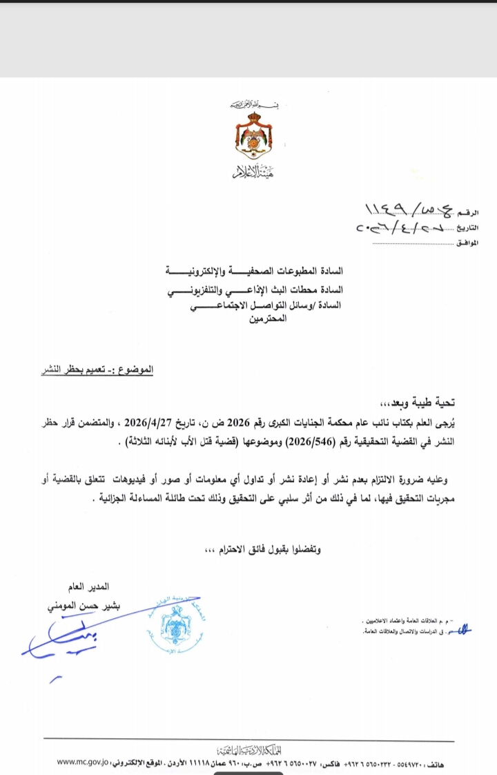 وجاء القرار استناداً لكتاب رسمي صادر بتاريخ 27 نيسان 2026، والمتعلق بالقضية التحقيقية رقم (2026/546)، حيث تقرر منع نشر أو تداول أي معلومات أو تفاصيل أو صور أو فيديوهات تتعلق بالقضية أو مجريات التحقيق فيها.