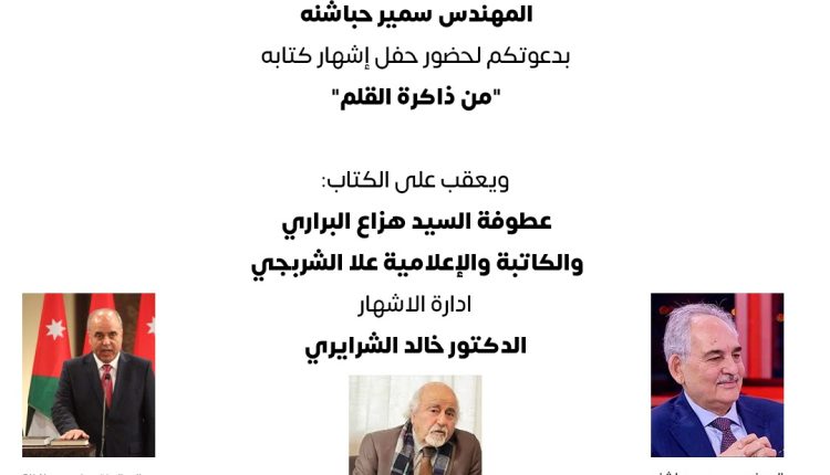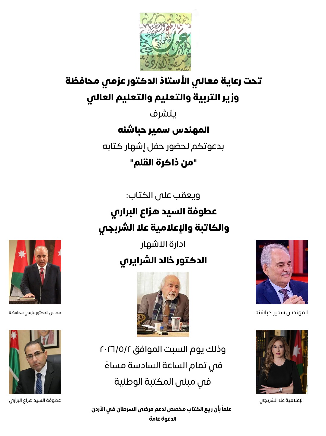 تحت رعاية معالي وزير التربية والتعليم والتعليم العالي ا.د. عزمي محافظة يشهر المهندس سمير الحباشنة كتابه “من ذاكرة القلم ” في السادسة من مساء السبت القادم الموافق ٢/٥/٢٠٢٦ في المكتبة الوطنية بالعاصمة عمان والذي يجمع في طياته مجموعة كبيرة وقيمة من مقالات ومحاضرات قدمها الوزير الحباشنة في مسيرته بالعمل الحكومي وسيعلق على الكتاب كل من الكاتب والروائي هزاع البراري والإعلامية د.علا الشربجي وسيدير اللقاء د. خالد الشرايري .
