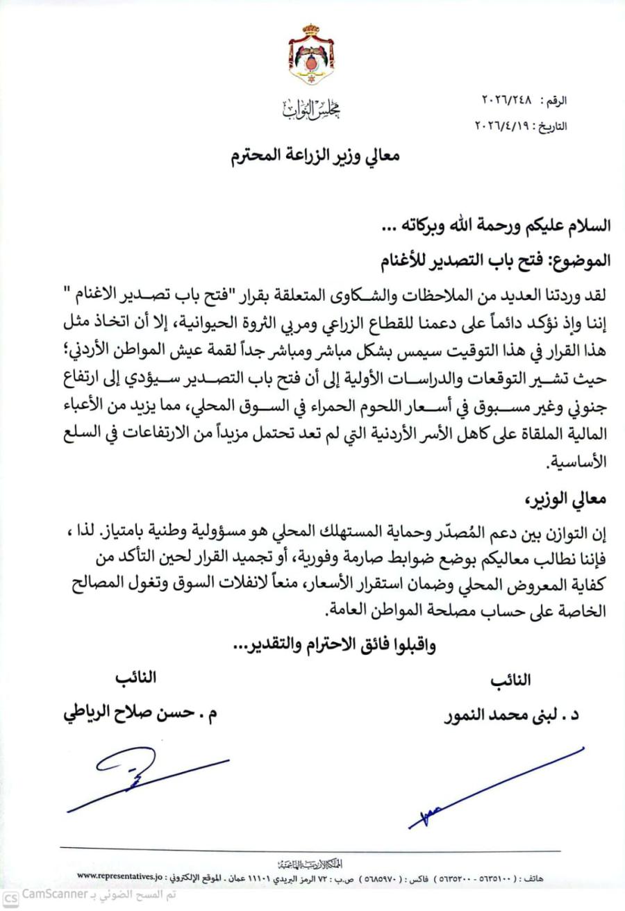 وأشار النائبان، في المذكرة رقم (248/2026) بتاريخ 19 نيسان 2026، إلى ورود شكاوى وملاحظات عديدة حول القرار، مؤكدين دعمهما للقطاع الزراعي ومربي الثروة الحيوانية، إلا أنهما شددا على أن توقيت فتح التصدير قد يؤثر بشكل مباشر على معيشة المواطن الأردني.