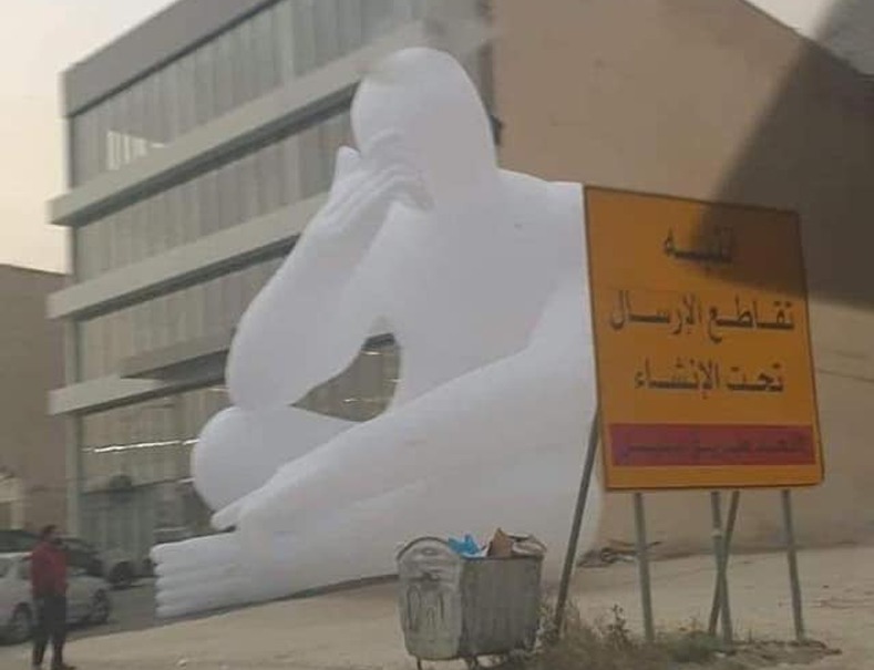 المجسم، تم وضعه، من قبل صاحب إحدى المجمعات التجارية الجديدة، لغايات الافتتاح، الامر الذي اثار التساؤلات، عن الرسالة التي يود ايصالها.