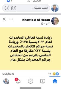 تقول الحسن: “زيادة تعاطي المخدرات عام ٢٠٢١ بنسبة ١٧٥٪ وزيادة جرائم الاتجار بالمخدرات بنسبة ٢٣٪ موازنة مع العام الماضي برغم انخفاض جرائم المخدرات بشكل عام”.