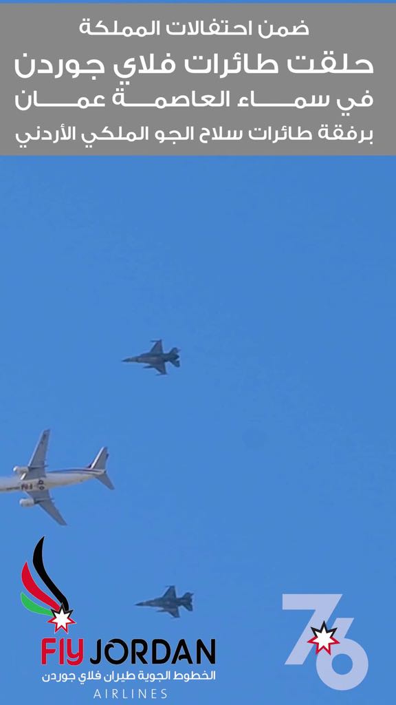 وقال المسلماني في منشور له ” حلقت طائرات فلاي جوردن في سماء عمان برفقة طائرات سلاح الجو المكلي الأردني بمناسبة عيد الاستقلال السادس والسبعون ونتقدم من حضرة صاحب الجلالة الملك عبدالله الثاني حفظه الله ورعاه وسمو ولي عهده الامين الحسين بن عبدالله الثاني حفظه الله بالتهنئة والتبريك سائلين المولى عزوجل ان يحفظ هذا الوطن من شر الفتن… ” .