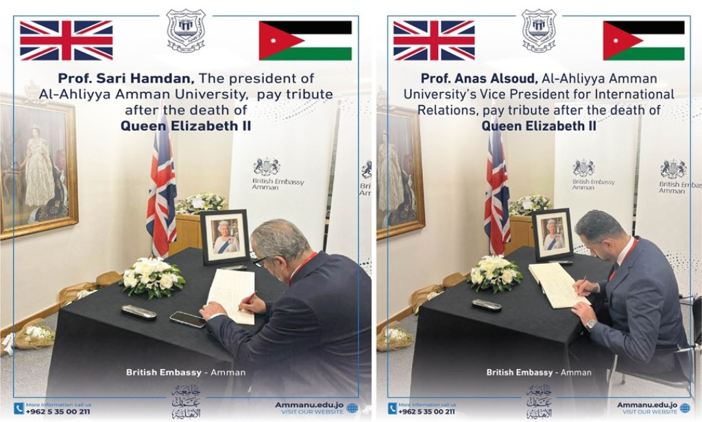 عمان الأهلية تقدم التعازي في السفارة البريطانية بوفاة جلالة الملكة إليزابيث الثانية