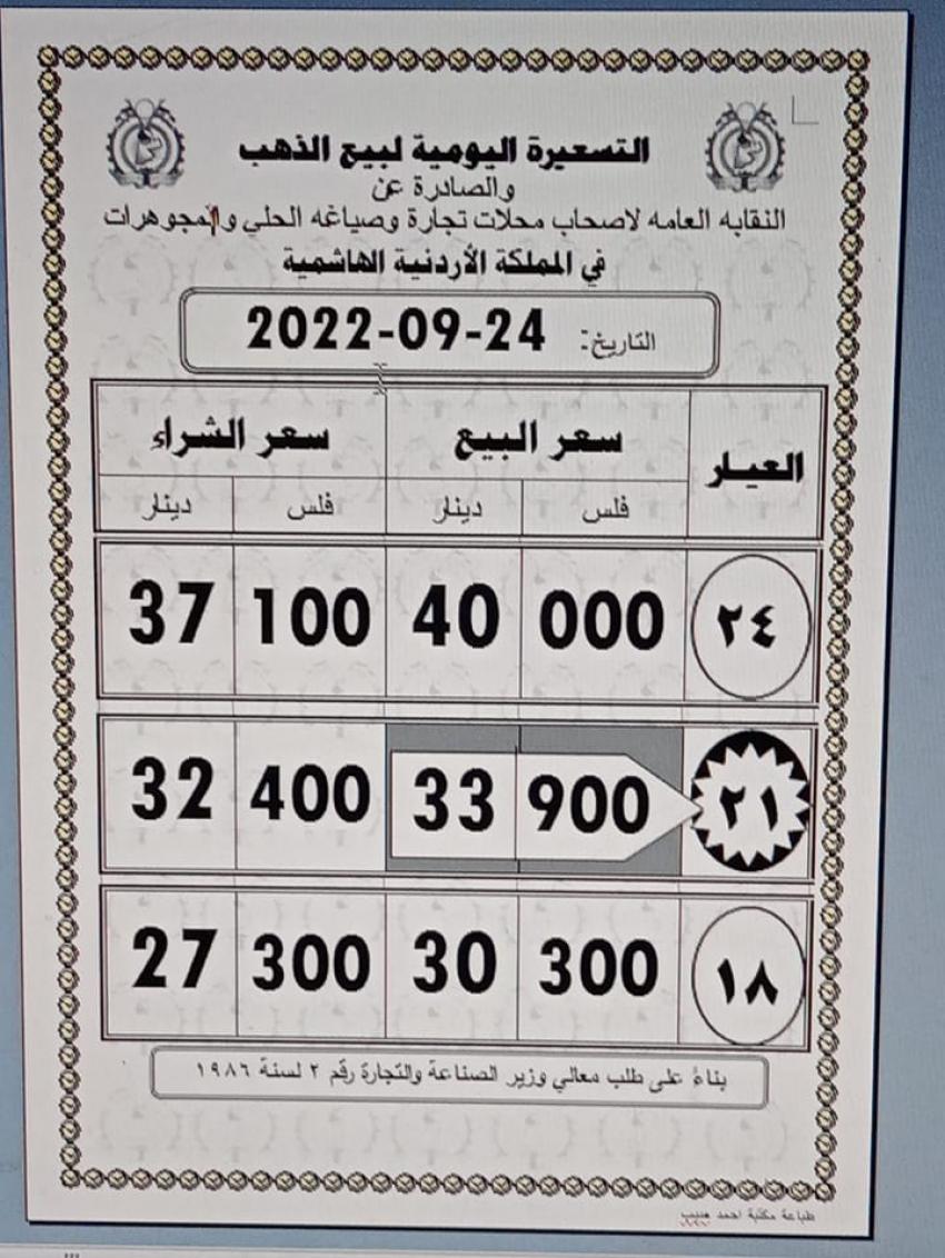 فيما بلغ سعر الذهب عياري (24) و (18) 40.00 و 30.30 دينارا على التوالي لجهة شراء المواطنين من التجار .