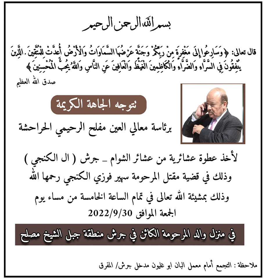 تتجه جاهة كريمة برئاسة العين مفلح الرحيمي، لأخذ عطوة عشائرية من عشائر الشوام في جرش، وذلك في قضية مقتل المرحومة سهير فوزي الكنجي رحمها الله.
