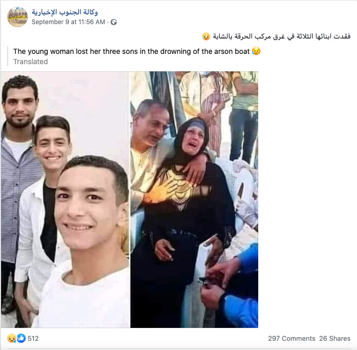 كما إن هاتين الصورتين ليستا لسيدة فقدت أبناءها الثلاثة في حادث غرق المركب قبالة السواحل التونسية، إذ تعود الصورة الأولى إلى سيدة من محافظة البحيرة المصرية، فقدت ثلاثة من أبنائها بعد أن غرقوا في شاطئ النخيل في حي العجمي التابع لمحافظة الإسكندرية في مصر في يوليو عام 2020.