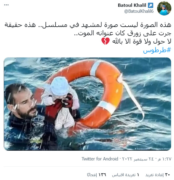 وحول الصورة التي تداولها مستخدمون على مواقع التواصل الاجتماعي على أنّها لإنقاذ رضيع بعد غرق المركب الغارق، فإنّها تعود لرضيع مغربي أنقذه أفراد الحرس المدني الإسباني قبالة شاطئ سبتة. ولم يتسنَّ لـ”مسبار” التثبت من هويّة الرضيع، إلّا أنّ نشر الصورة قديمًا ينفي أن تكون لرضيع أُنقذ عقب غرق المركب قبالة سواحل طرطوس يوم 22 سبتمبر/أيلول الجاري.