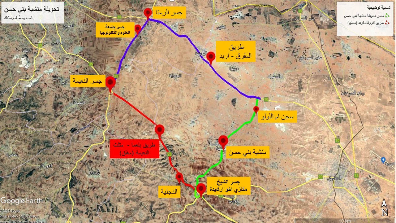 وقالت الوزارة في بيان صحفي، اليوم السبت، إنه سيجري تحويل حركة السير القادم من الزرقاء باتجاه إربد (مثلث النعيمة) إلى طريق (منشية بني حسن – أم اللولو) باتجاه طريق (المفرق – إربد) وصولاً إلى جسر الرمثا، والاتجاه نحو طريق (إربد – عمان ) إلى جسر النعيمة وبالعكس، وذلك من خلال الانعطاف يميناً بعد نهاية جسر الشيخ مكازي أخو إرشيدة باتجاه طريق (المفرق – قضاء رحاب – جرش) ثم الانعطاف يميناً بعد 500 متر من جسر مكازي أخو إرشيدة إلى مدخل بلدة الصهاه (خلف المحطة الحرارية) وصولاً إلى مسار التحويلة وفق اللوحات الارشادية التي جرى وضعها للدلالة والإرشاد، كما أنه سيجري العمل على تأمين طرق خدمية داخل المشروع لخدمة المجتمع المحلي فقط.