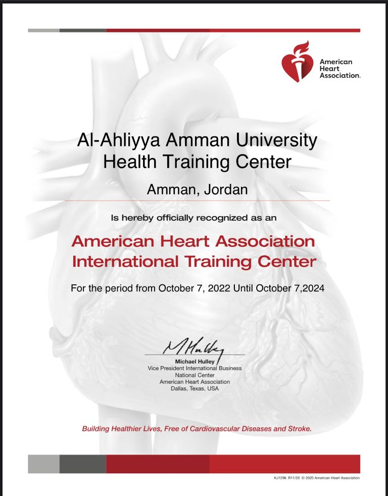 على موافقة وزارة التعليم العالي لعقد دورات متخصصة في التعليم الصحي، وهو المركز الأول في الأردن المعتمد لجمعية القلب الامريكية