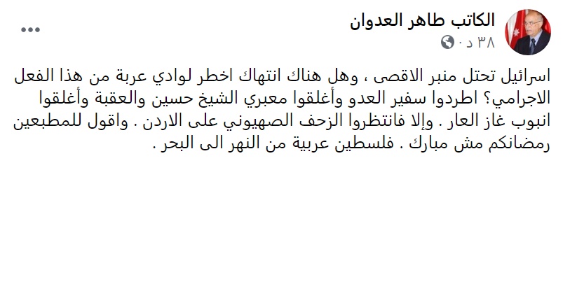 اسرائيل تحتل منبر الاقصى ، وهل هناك انتهاك اخطر لوادي عربة من هذا الفعل الاجرامي؟ اطردوا سفير العدو وأغلقوا معبري الشيخ حسين والعقبة وأغلقوا انبوب غاز العار . وإلا فانتظروا الزحف الصهيوني على الاردن . واقول للمطبعين رمضانكم مش مبارك . فلسطين عربية من النهر الى البحر .