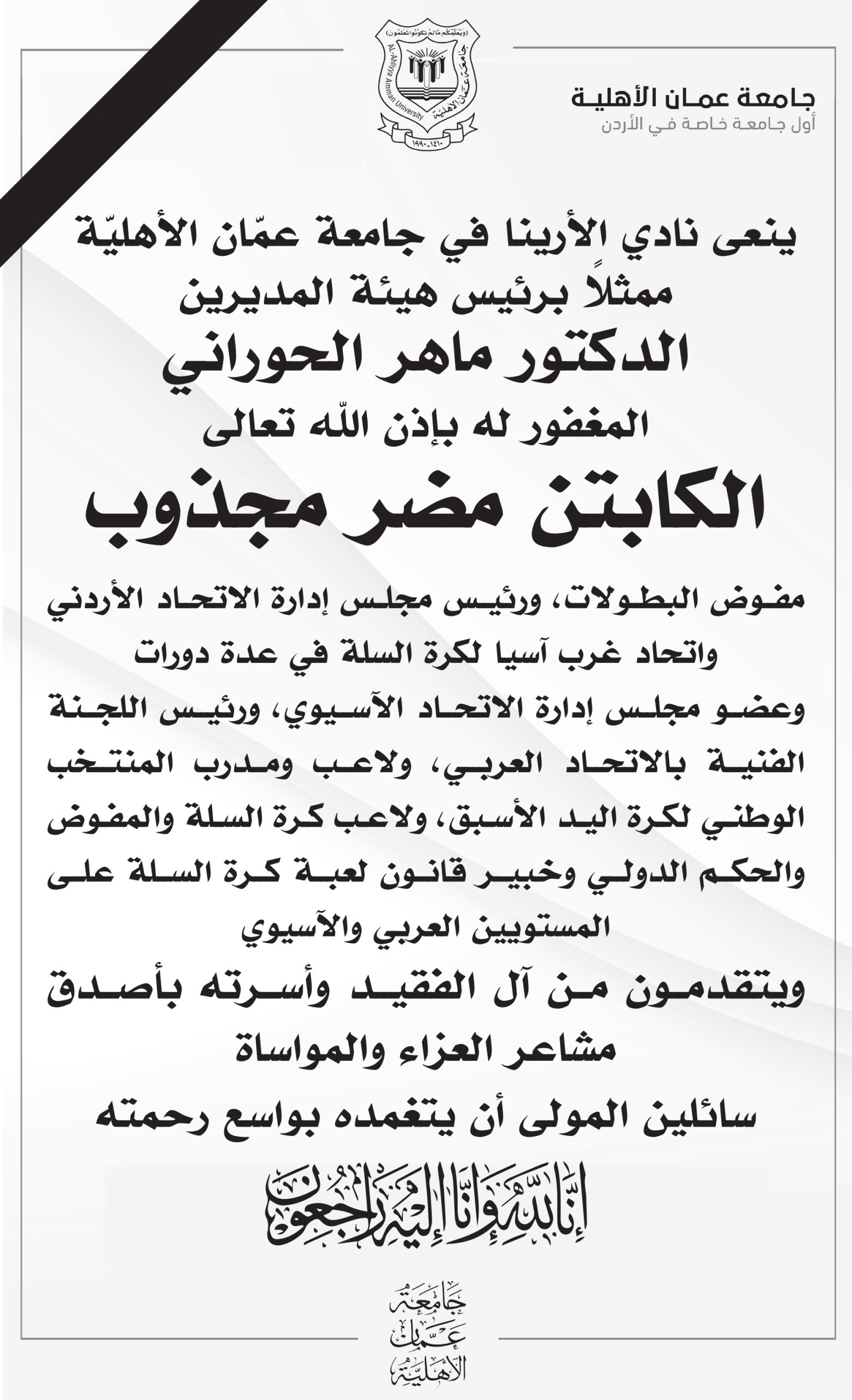 ينعى نادي الأرينا في جامعة عمان الأهليّة