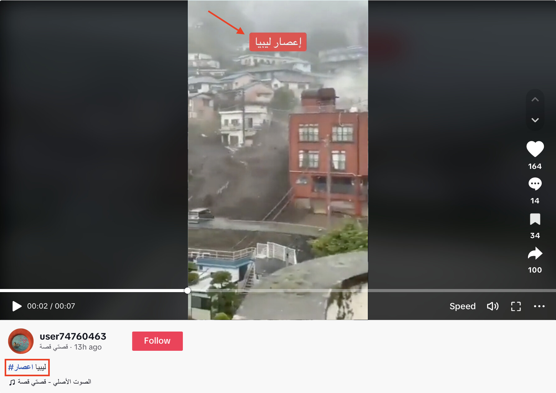 وانتشر فيديو ادّعى ناشروه على أنّه للحظة اجتياح السيول الناتجة عن إعصار دانيال في ليبيا، لوادي مدينة درنة. وتبين بالتحقق أنّه مضلّل، ونُشر في إبريل/نيسان عام 2016 على أنّه لسيول ضربت إحدى أودية السعودية حينها، بعد هطول أمطار غزيرة.