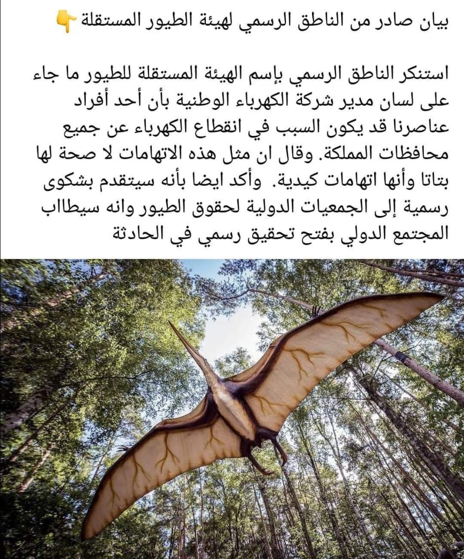 الوزير الاسبق سعد الخرابشة، كتب عبر تويتر معلقا على فرضية الطائر، “كان من أول يوم ريحنا مدير شركة الكهرباء بفرضية الطائر الضخم وما دخلنا بحيص بيص”.