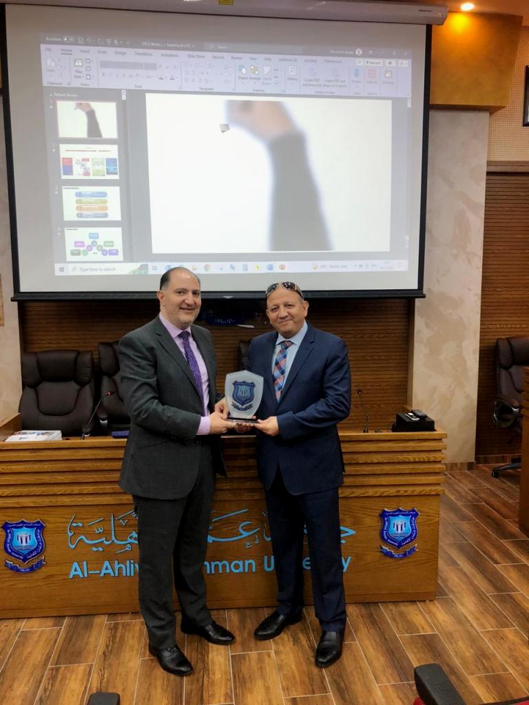 كما عميد كلية الصيدلة بالجامعة الأستاذ الدكتور وسام عماري درعاَ تكريماً للدكتورالرصاصي تقديراً لجهوده وتعاونه المستمر في تقديم محاضرات وورش عمل مشاركة مع جامعة عمان الأهلية.