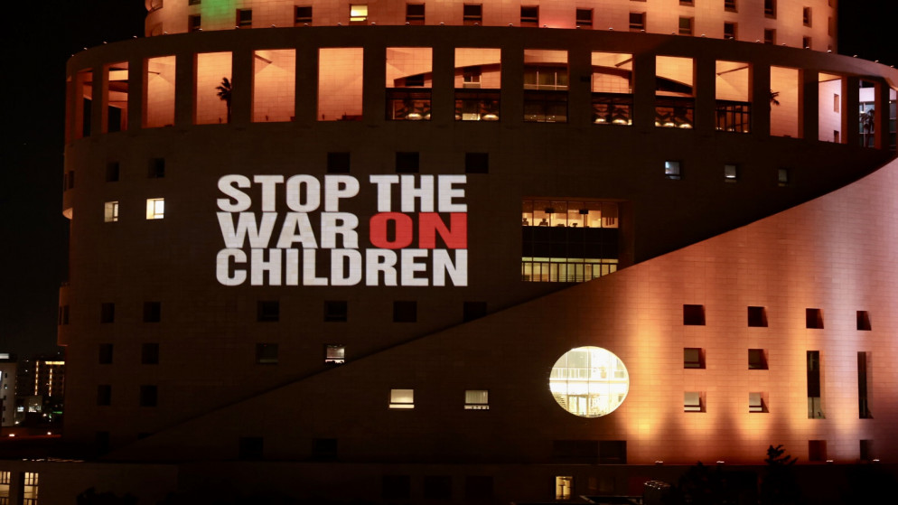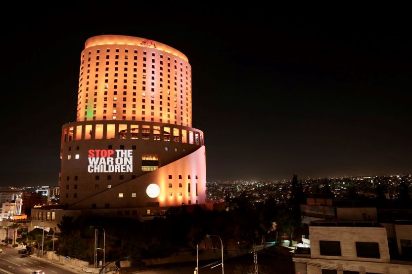 دعت منظمة “أنقذوا الأطفال” مساء الاثنين، إلى وقف إطلاق النار في قطاع غزة، وذلك عبر إضاءة تطالب بذلك على واجهة فندق في عمّان.