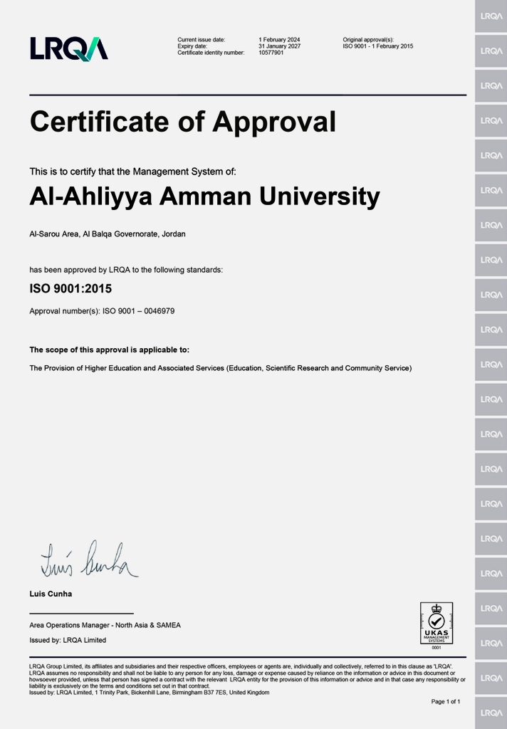 حصلت جامعة عمان الأهلية على شهادة نظام إدارة الجودة الأيزو 9001:2015 في مجالات التعليم والتعلم والبحث العلمي وخدمة المجتمع ولكافة الوحدات الأكاديمية والإدارية، وذلك بعد أن تم تجديد الشهادة للأعوام الثلاثة القادمة (2024 – 2027).